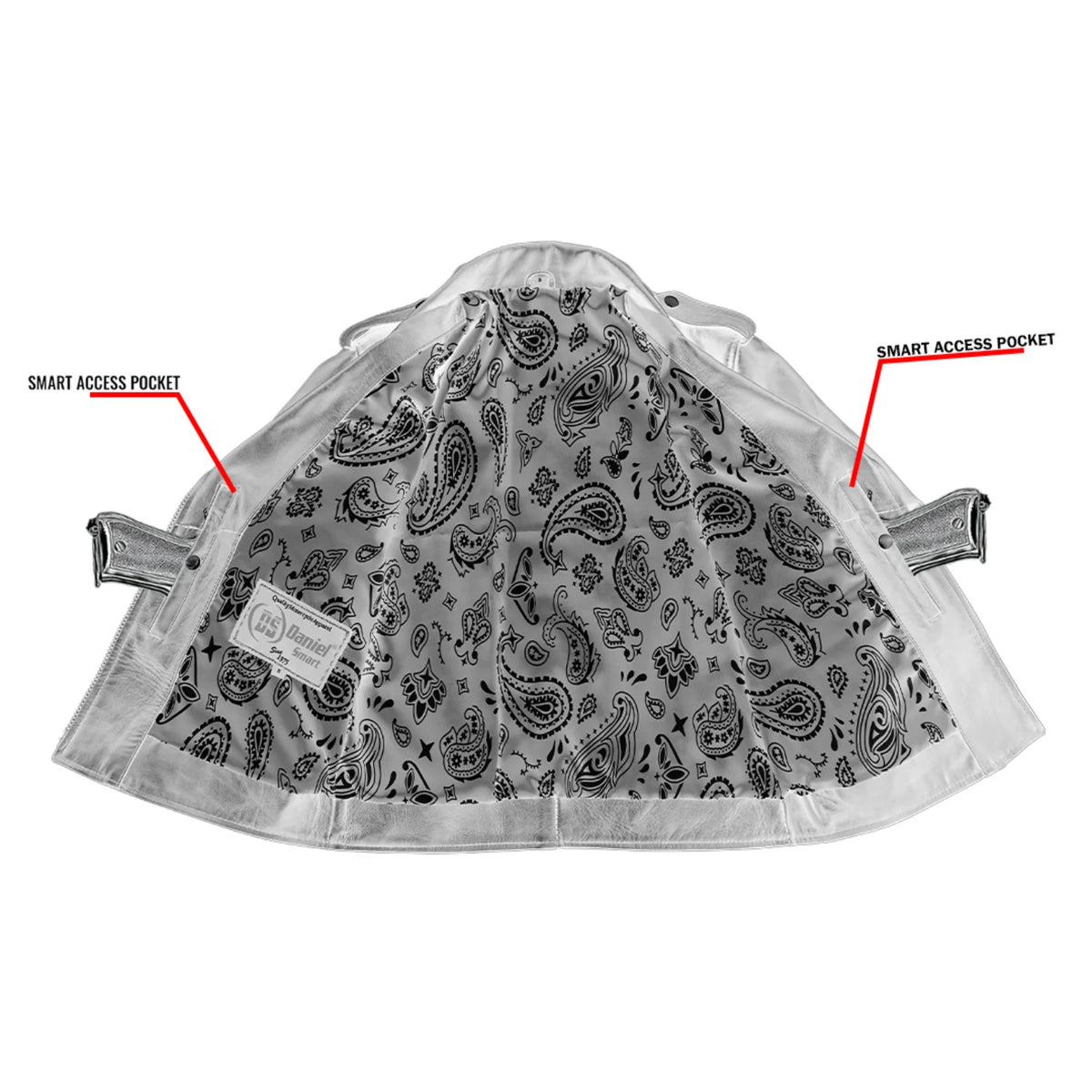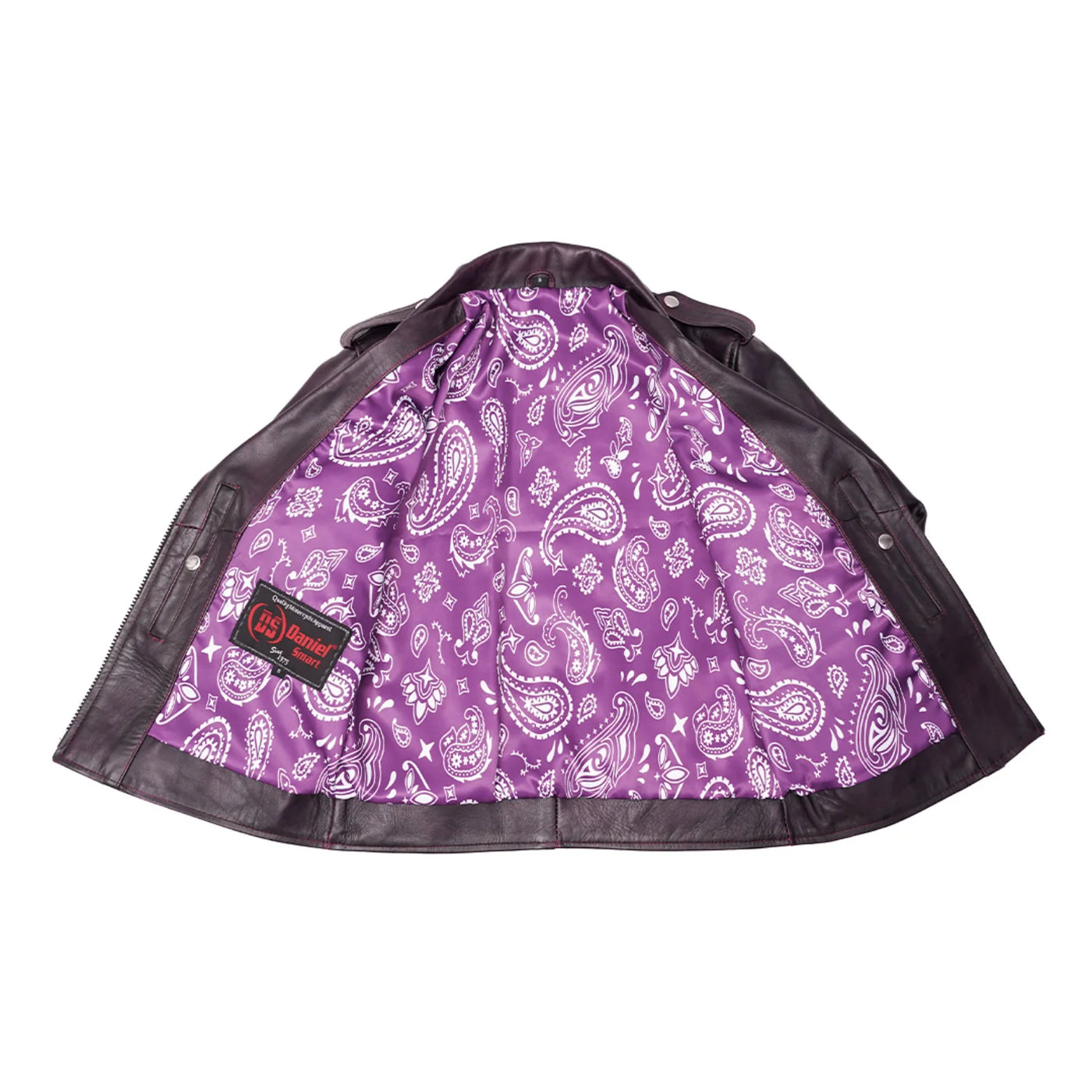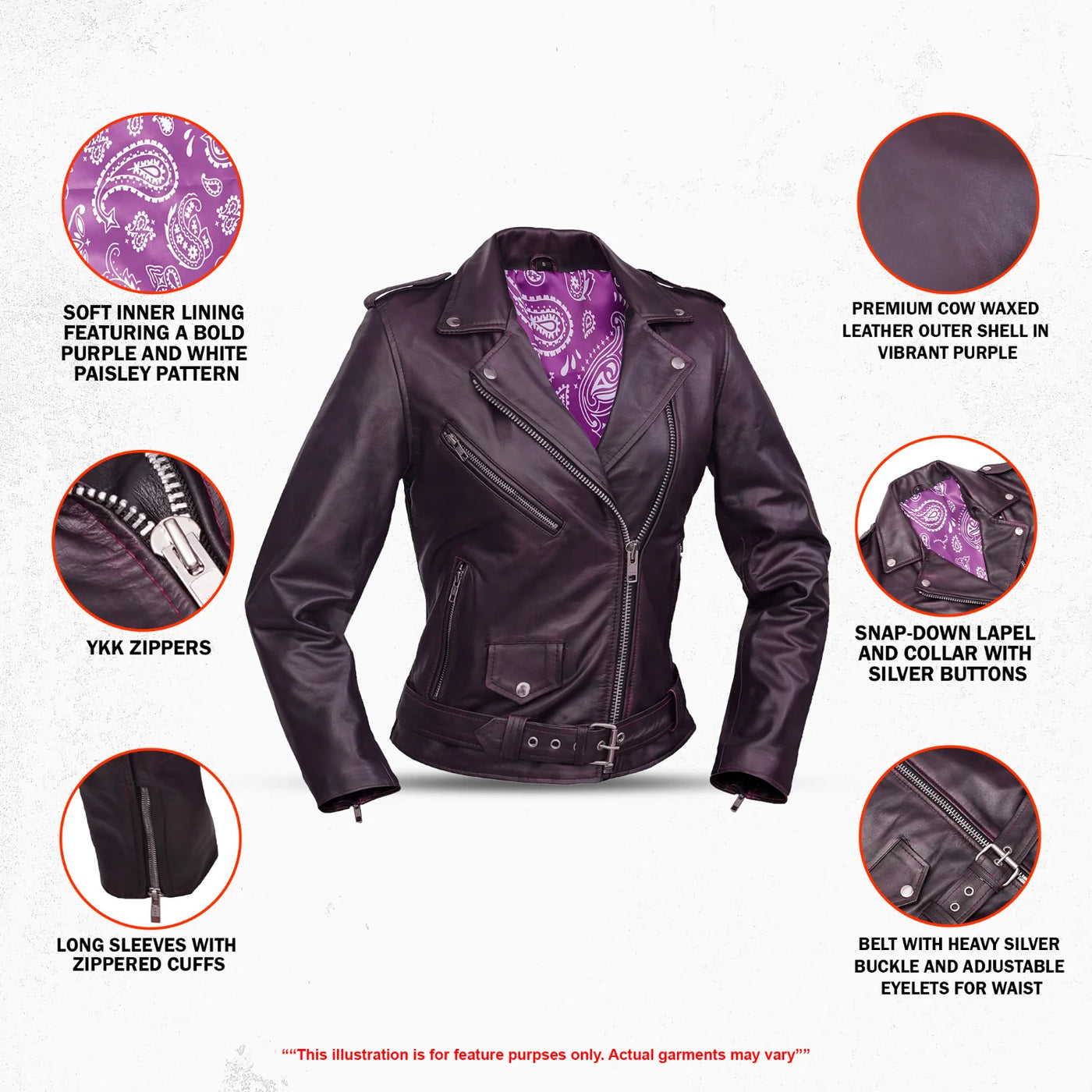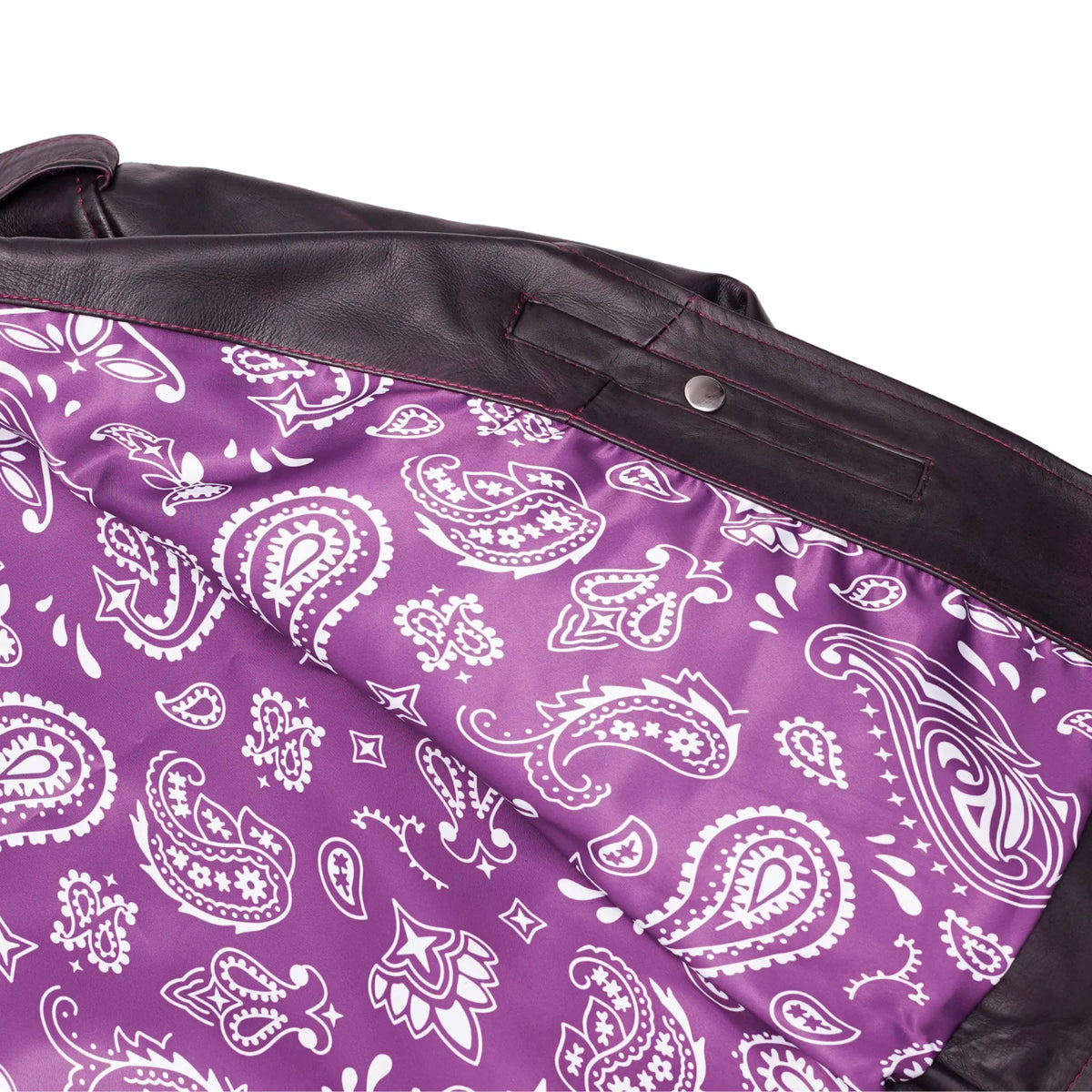 The Amora Women’s Leather Motorcycle Jacket blends bold fashion with high-quality craftsmanship, perfect for women seeking style, comfort, and performance on every ride. Constructed from premium cow waxed leather, this jacket features a vibrant purple outer shell that exudes confidence and individuality. The interior is thoughtfully designed for comfort and durability, featuring a soft cotton and Korean arm liner, a three-panel white stain vest liner, and a complete sublimation lining with a purple background and white paisley detailing for a luxurious finish. A striking front zipper, wide lapel collar with silver buttons, and a built-in adjustable belt with silver buckle enhance the jacket’s classic biker silhouette. Crafted with heavy purple thread stitching and reinforced with original YKK zippers, the Amora jacket is built to last while delivering a bold, feminine statement on the road.