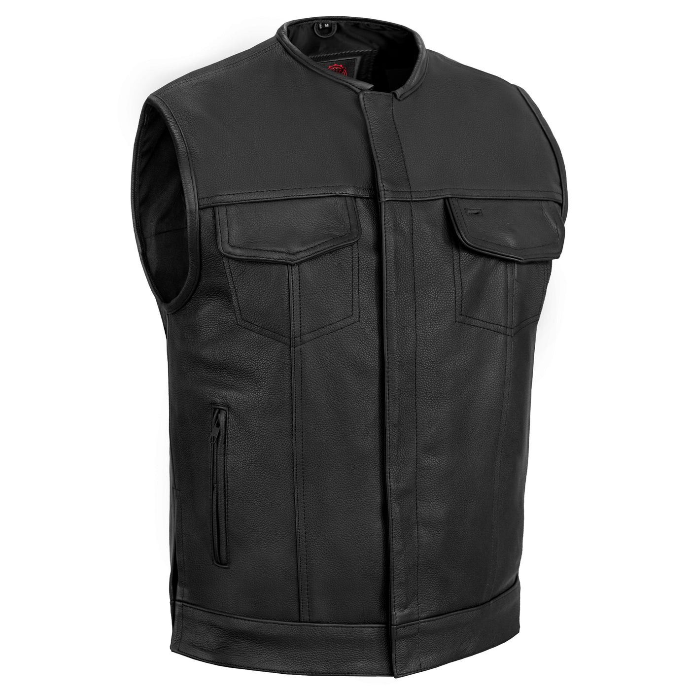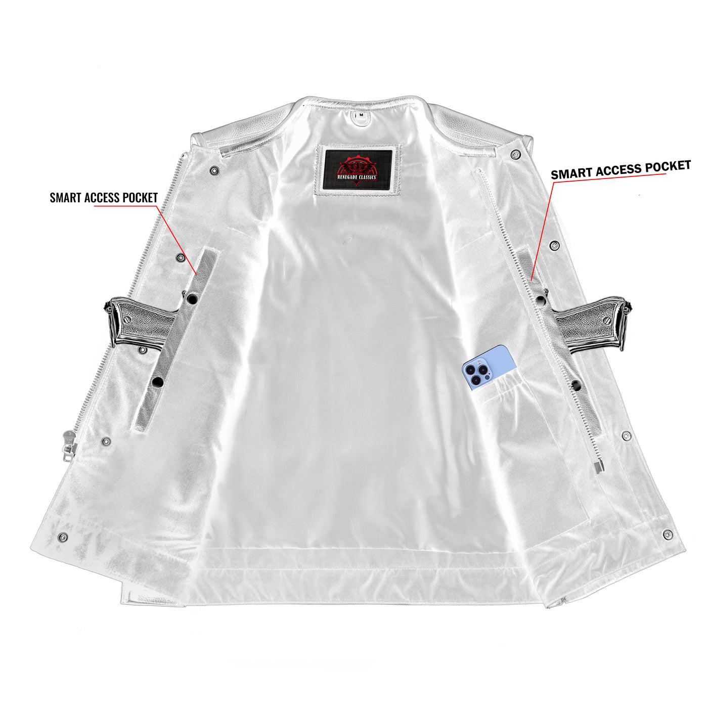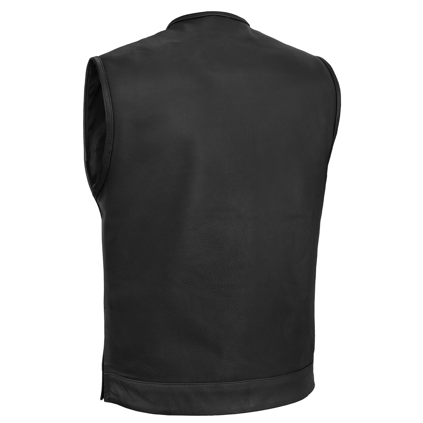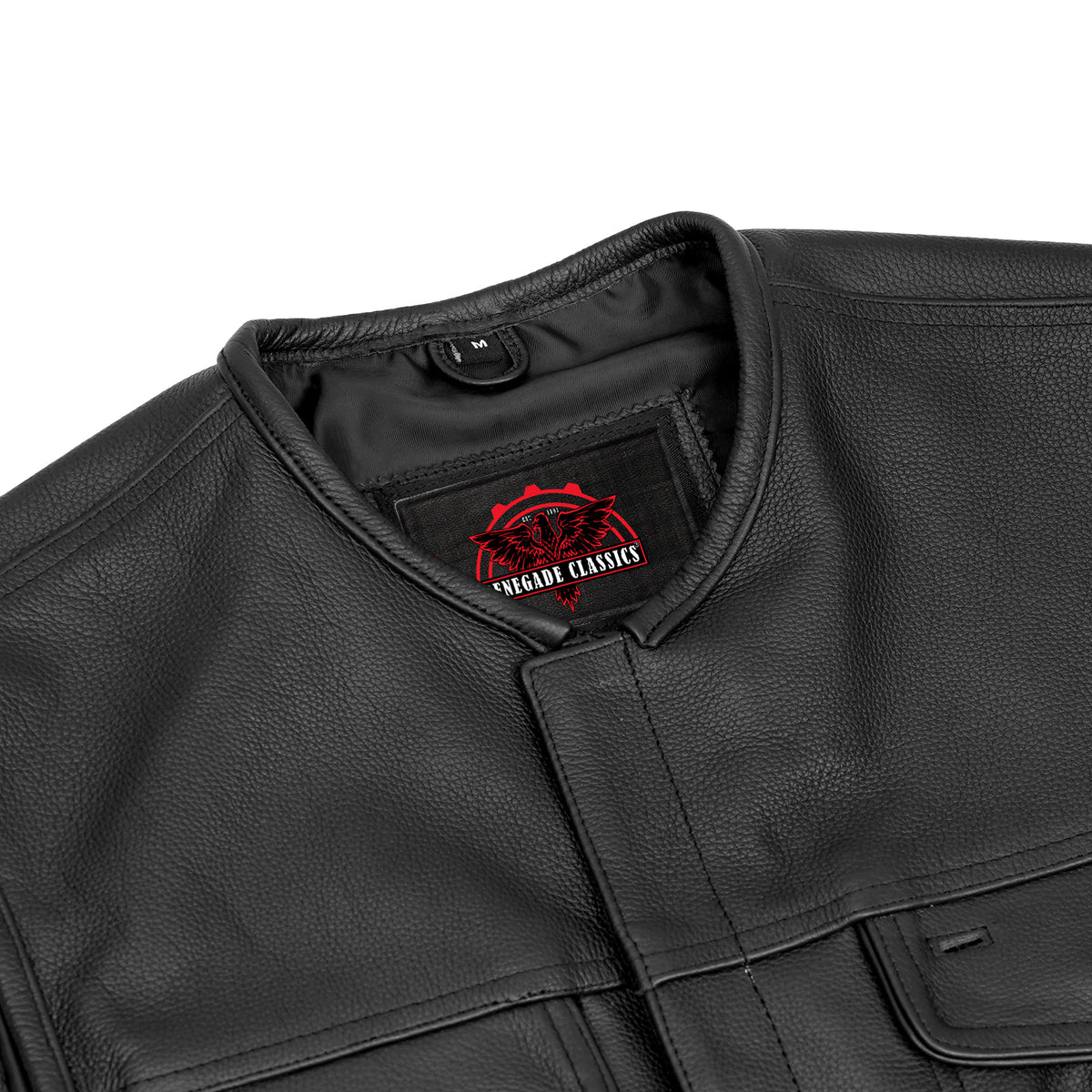 Our collarless, black leather vest is made from premium drum-dyed cowhide. The Smart Access Pockets blend in between the exterior snaps, and have built-in holsters and snap closures for extra security. We added in shoulder reinforcements for discreet Safety Tool carrying, too.