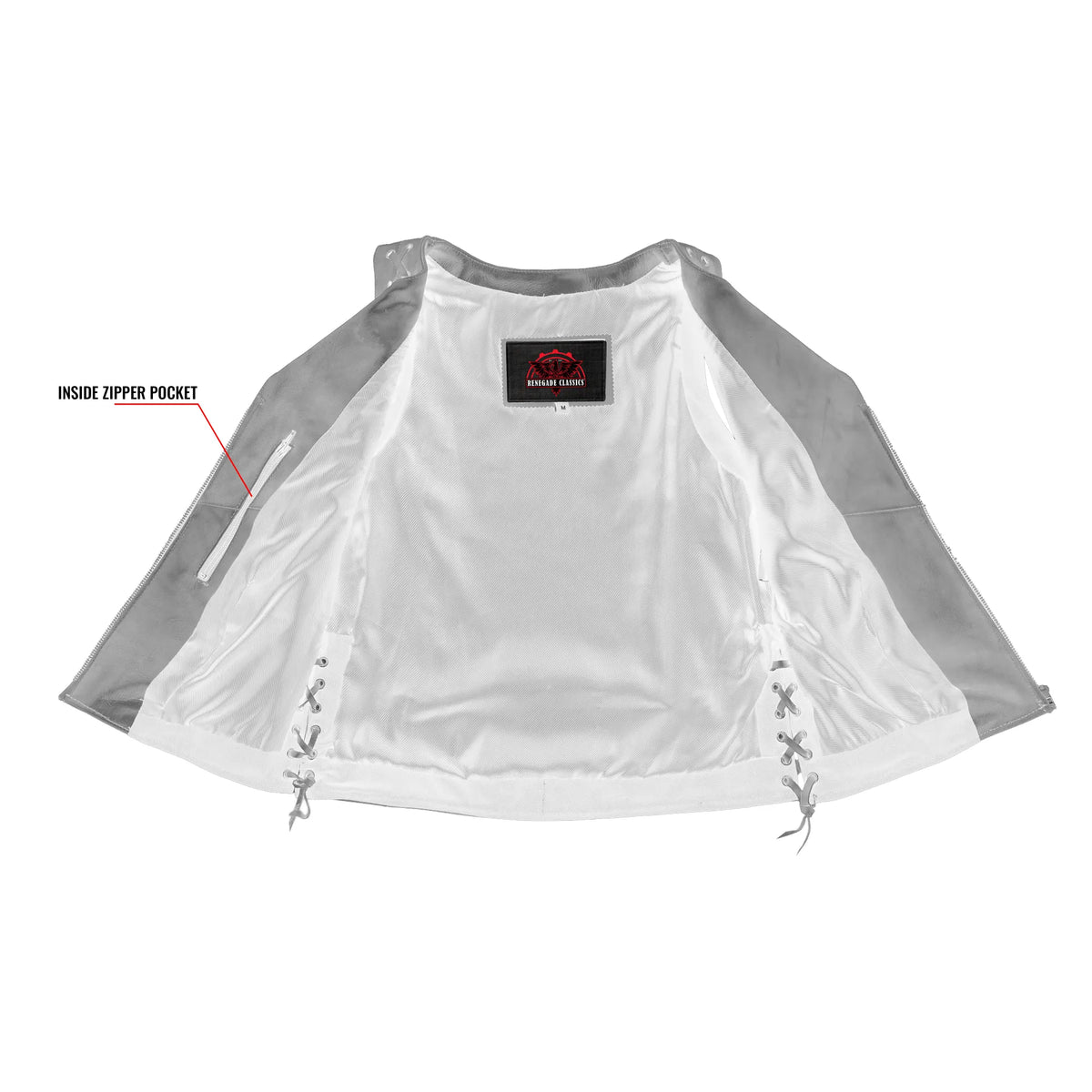 Zipper front closure w/lacing and studs detail.
