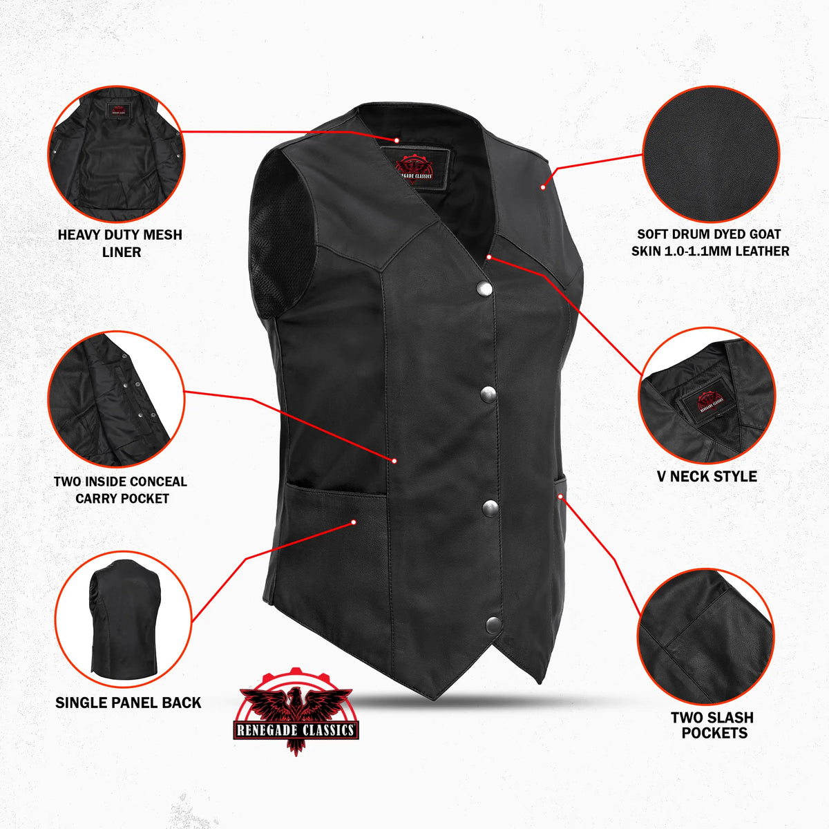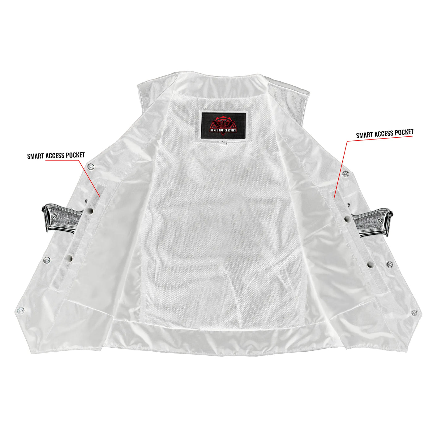 2 inside Smart Access Pockets made of special heavy duty textile with built-in holsters and snap closure.