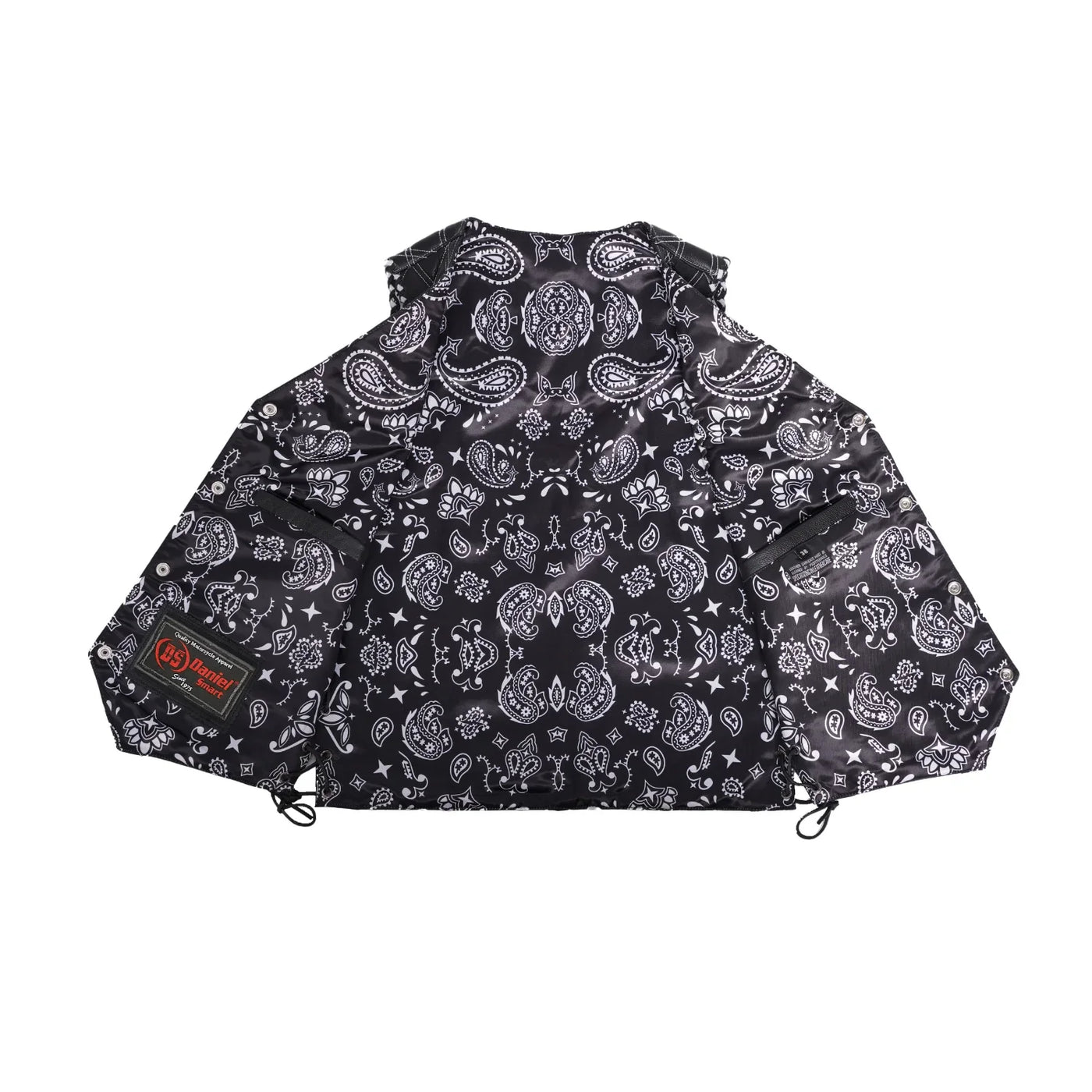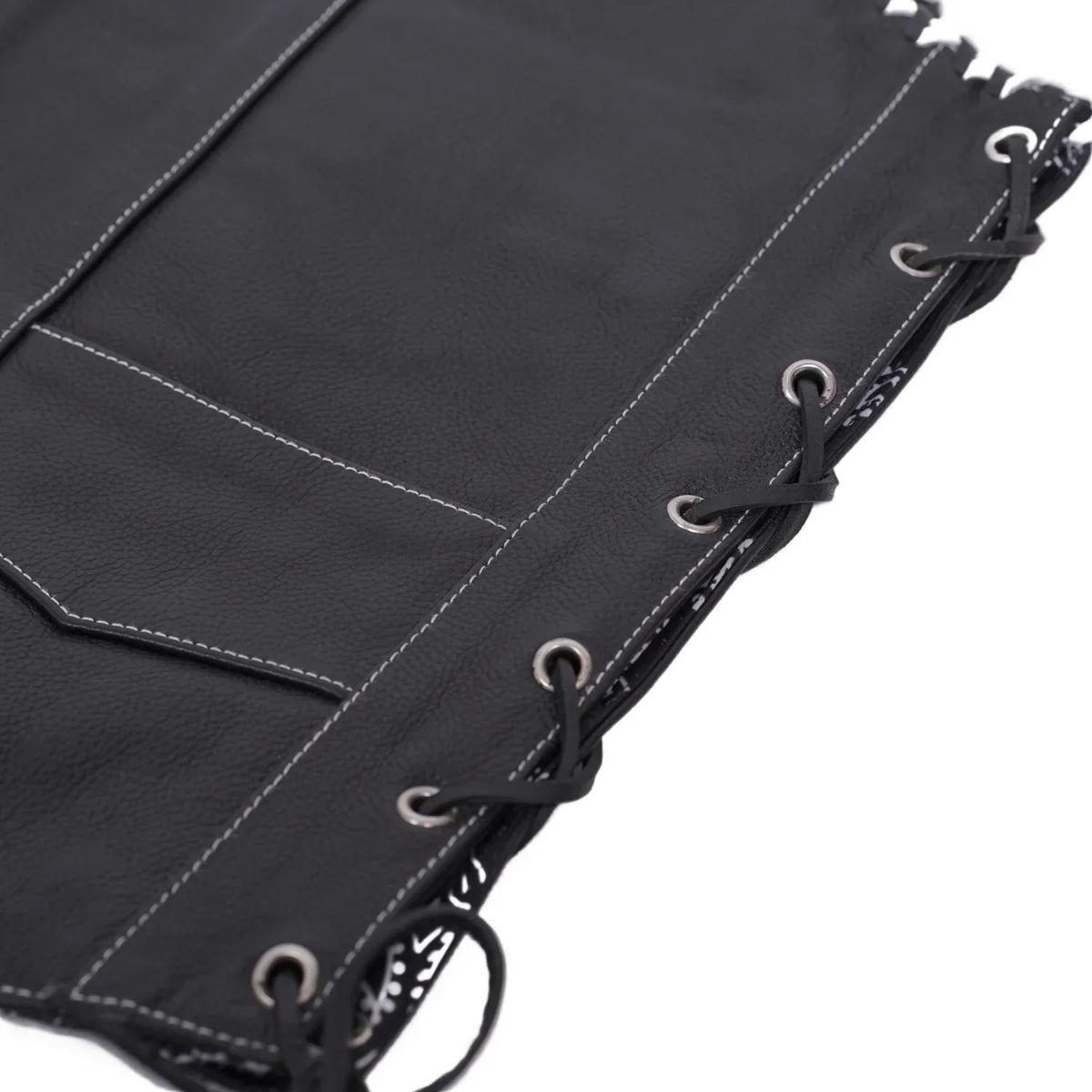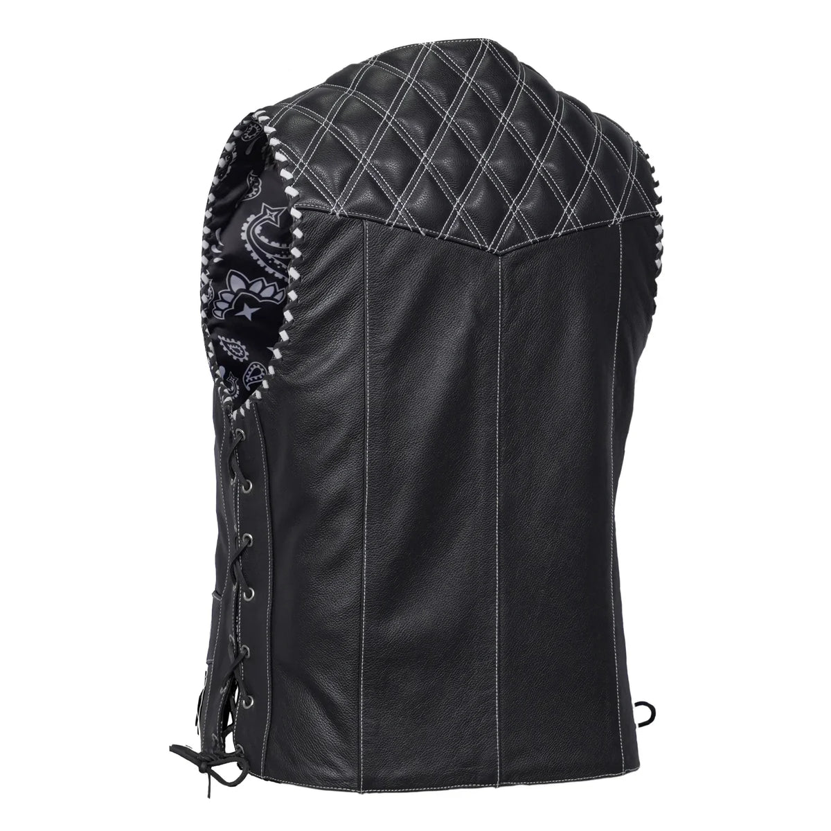 The Midnight Thread Men’s Leather Vest is built for riders who want rugged strength with a touch of unique style. Crafted from premium black leather with fine detailing, this vest brings together function and durability. Designed with bold embroidery on the chest panels and a paisley-style printed lining, the Midnight Thread offers a refined edge that speaks of confidence and biker spirit. Heavy thread stitching guarantees long-lasting performance, while side laces and adjustable eyelets allow for a custom fit. White stitching and white braiding along the armholes add the finishing touches to this powerful design.