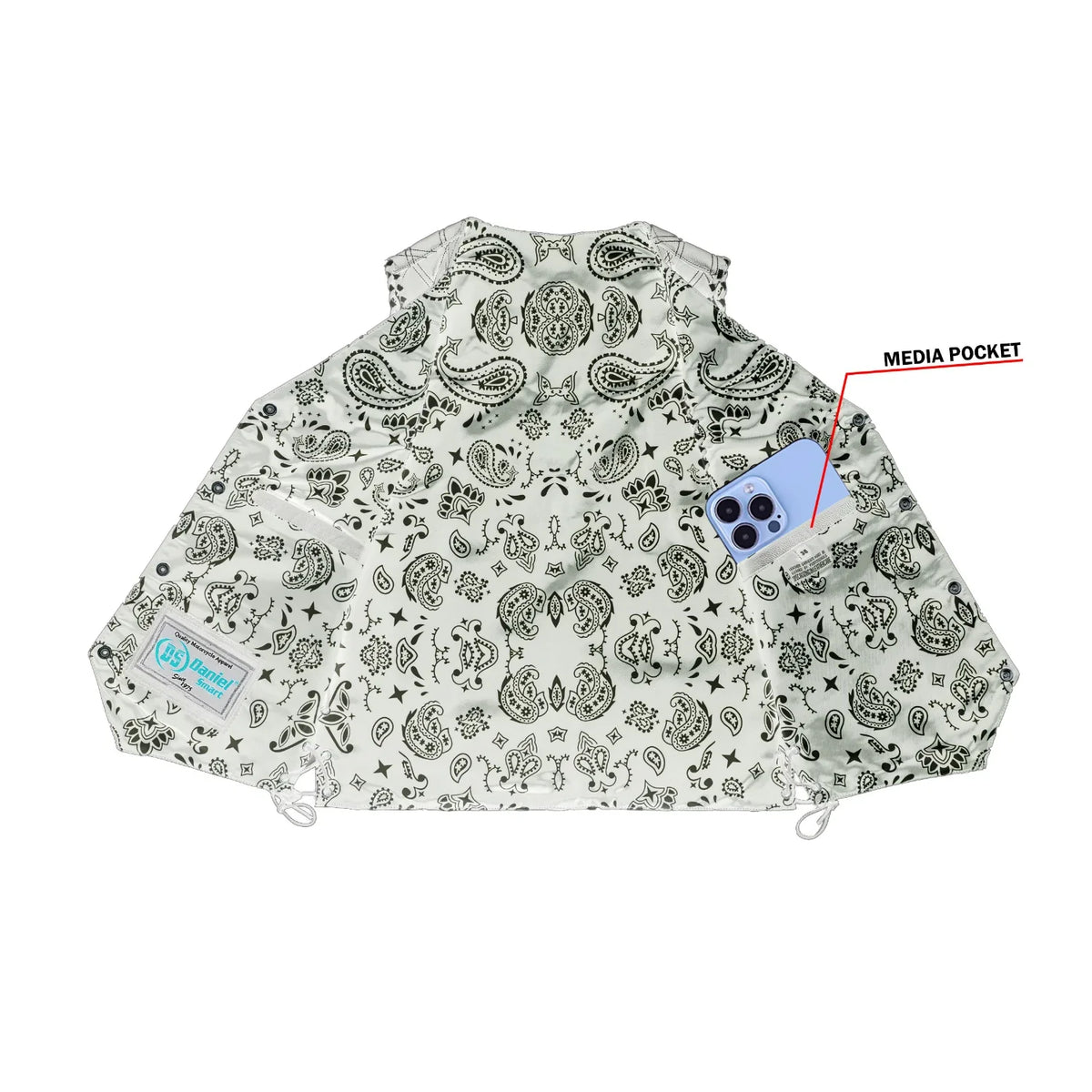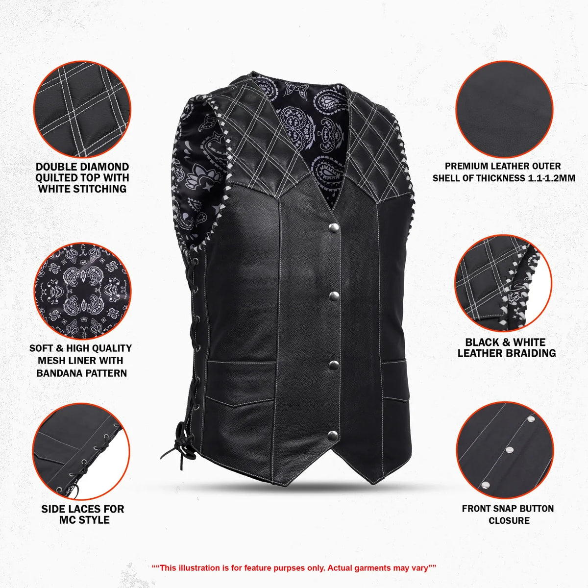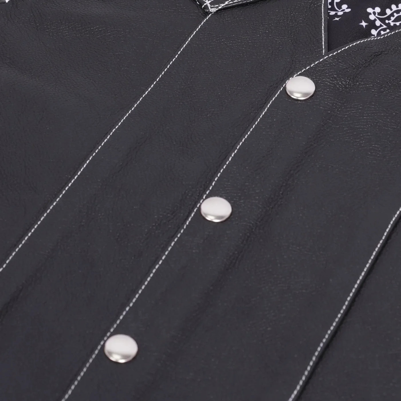The Midnight Thread Men’s Leather Vest is built for riders who want rugged strength with a touch of unique style. Crafted from premium black leather with fine detailing, this vest brings together function and durability. Designed with bold embroidery on the chest panels and a paisley-style printed lining, the Midnight Thread offers a refined edge that speaks of confidence and biker spirit. Heavy thread stitching guarantees long-lasting performance, while side laces and adjustable eyelets allow for a custom fit. White stitching and white braiding along the armholes add the finishing touches to this powerful design.