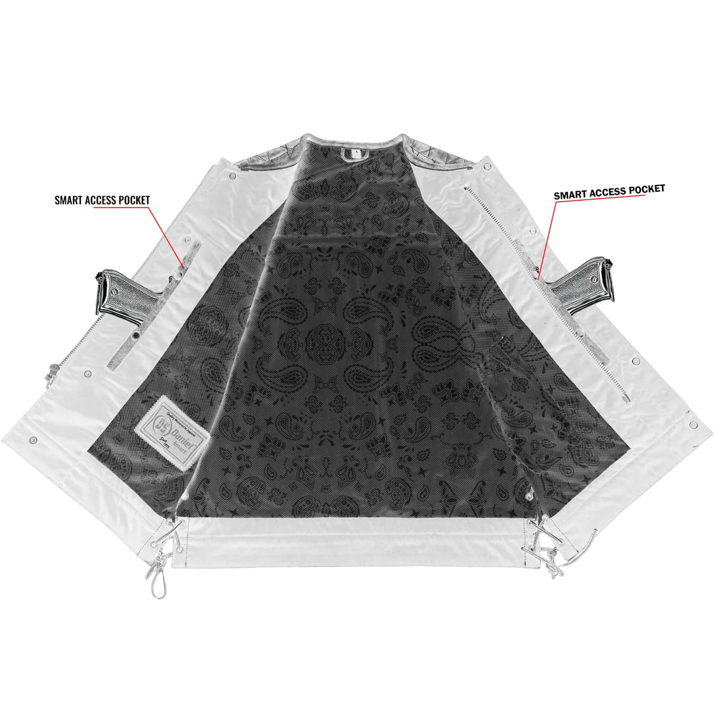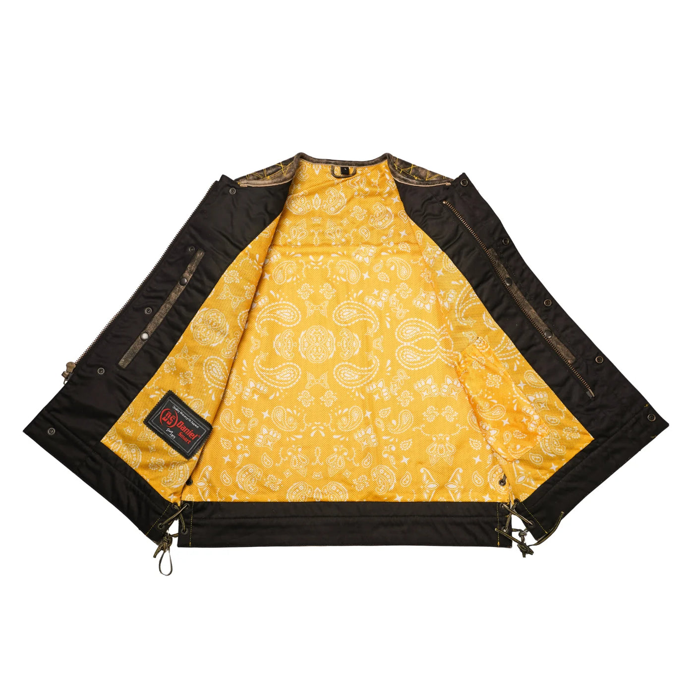 The Rust Rider Men’s Leather Vest is built for bikers who want rugged durability with a bold edge. Crafted from premium Antique Brown leather and perforated panels, it’s designed to deliver both protection and airflow, making every ride more comfortable. With its dual-color embroidery, patriotic sublimation lining, and tough construction, this vest is more than gear—it’s a rider’s statement. The hidden YKK zipper under a snap-placket keeps wind and rain at bay, while heavy-duty thread stitching ensures long-lasting wear. With side laces for adjustable fit and a no-collar cut for classic biker style, the Rust Rider strikes the perfect balance between functionality and attitude.